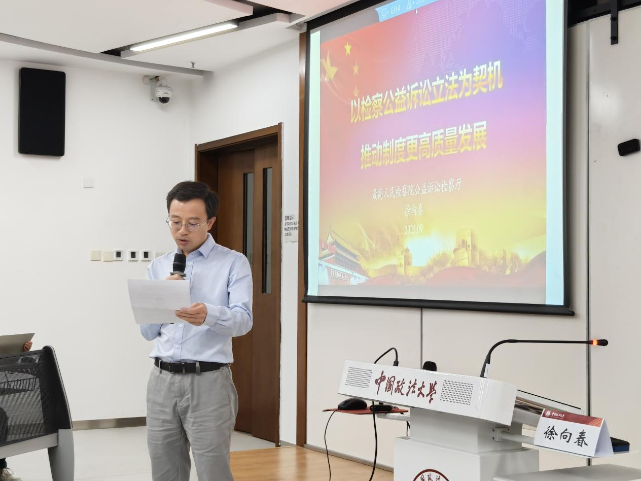 2025年9月19日14点30分,由中国政法大学研究生院主办的最高人民检察院 “检察实务专家进校园” 活动暨高级法官、检察官司法前沿讲堂第七十五讲、“检察学理论与实践” 课程第十二讲,在海淀校区教学图书综合楼0202教室圆满举行。本次讲堂特邀最高人民检察院公益诉讼检察厅厅长、一级高级检察官、诉讼法博士徐向春主讲,以《以检察公益诉讼立法为契机,推动制度更高质量发展》为题,深度解读检察公益诉讼制度的理论根基、实践成效与立法重点问题。讲堂由中国政法大学研究生院副院长王银宏教授主持,诉讼法学研究院谭秋桂教授、法学院副院长张力教授与谈,校内外师生齐聚现场,学术交流氛围浓厚。