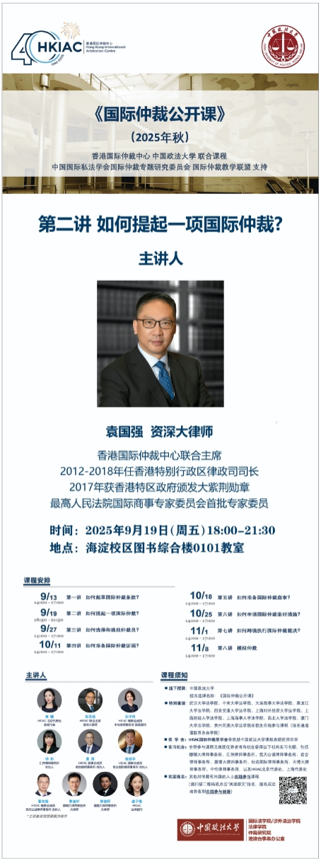 香港国际仲裁中心联合主席袁国强资深大律师将于9月19日(周五)18:00-21:30在海淀校区图书综合楼0101教室作题为“如何提起一项国际仲裁?”的讲座。本场讲座系2025年秋季学期《国际仲裁公开课》第二讲。欢迎各位同学积极参与公开课!